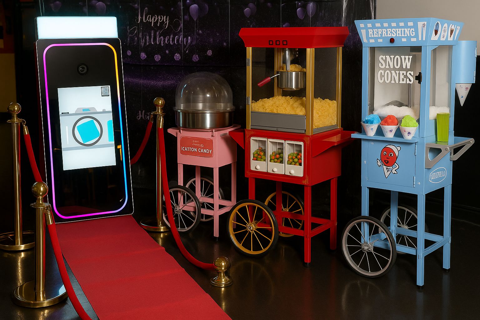 We combine bounce houses, mirror photo booths, and smoke machines with delicious concessions — popcorn and candy bars.